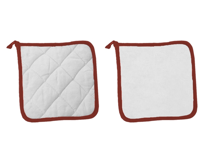 Sujetador de utensilios calientes, de tela tipo manta en color blanco con detalles al filo y presilla para colgar.