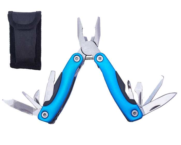 Herramienta plegable con 9 funciones: pinzas de punta, 2 desarmadores planos, desarmador de cruz, cuchillo, sierra, destapador doble, lima y cuña metálica. Superficie anti deslizable, estuche de tela.