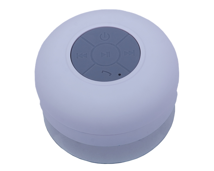 Bocina bluetooth. Botón de encendido y controles de audio. Base de plástico adherible a superficies como vidrio, cerámica y porcelana, No debe sumergirse completamente. Incluye cable de carga.