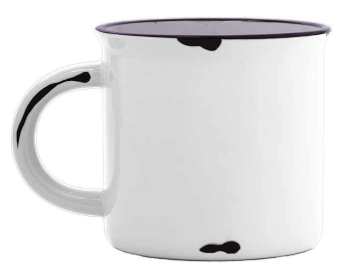 Taza de cerámica de boca abierta. Exterior con efecto retro, que simula desgaste de tiempo. CAP. 415 ml. (14 OZ). Venta en múltiplos de 12.