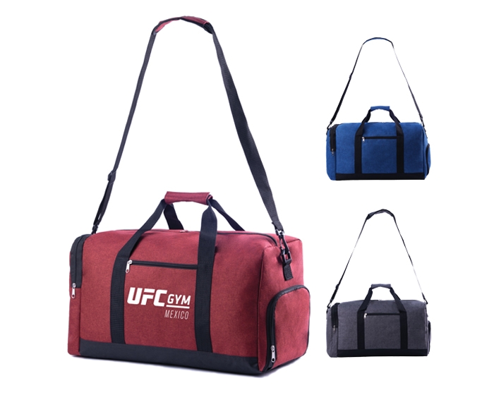 Maleta deportiva con dos compartimentos laterales, uno para guardar tenis y el segundo para objetos personales. Cuenta con bolsa externa con cierre, asa central ajustable y asas laterales.
