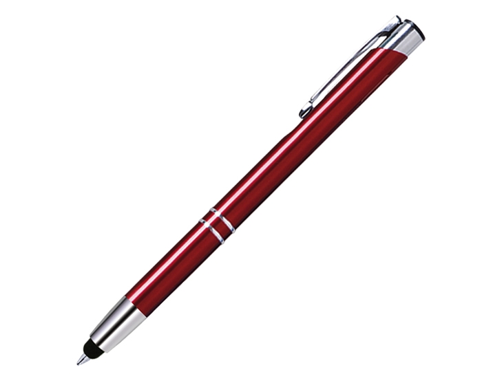 Bolígrafo delgado de aluminio, con punta cromada y punta touch para pantallas táctiles. Mecanismo de click.