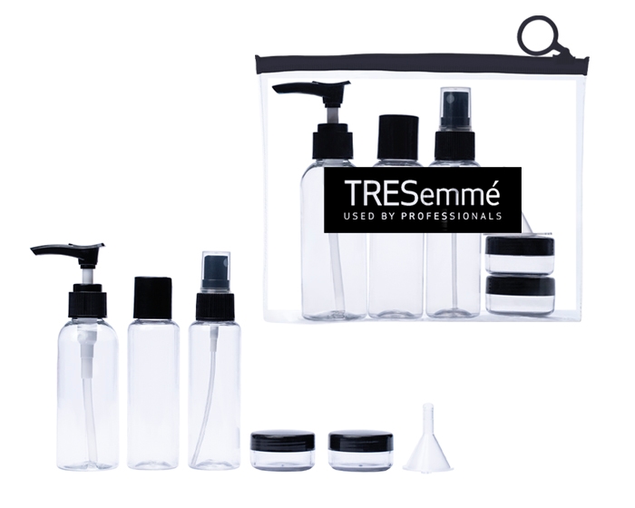 Set de contenedores para viaje incluye un envase despachador (80 ml), envase con atomizador (60 ml), Envase (60 ml), Dos contenedores para crema (10 ml) y un embudo. Estuche transparente con cierre.