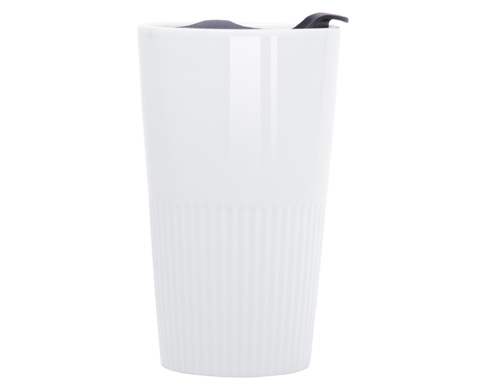 Vaso de cerámica brillante de doble pared, cuenta con tapa a presión con seguro deslizable. CAP. 300 ml. (10 OZ).