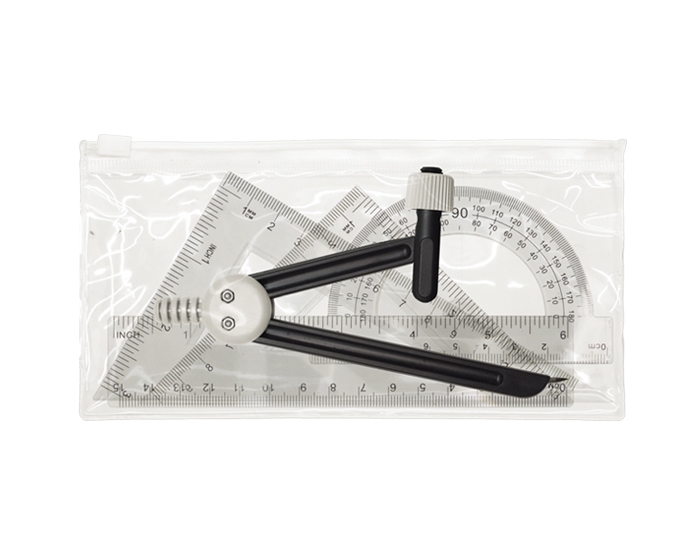 Juego de geometria con estuche de PVC y cierre de presión. Incluye regla de 15 cm, 2 escuadras, compás y transportador.
