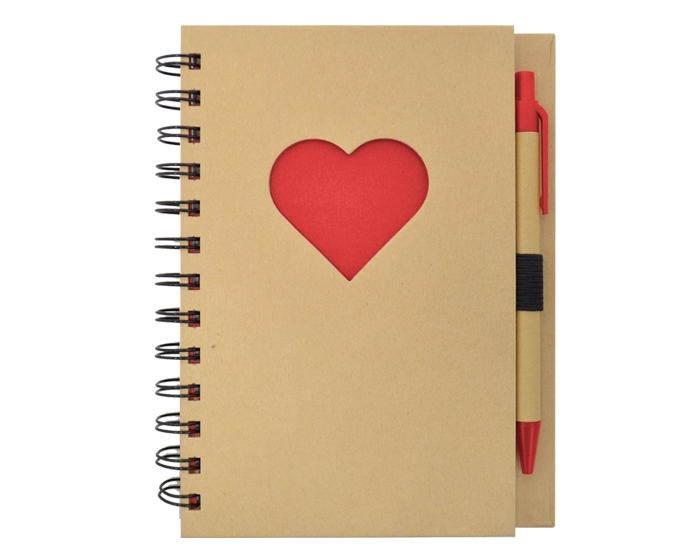 Libreta ecológica de cartón con espiral metálico, hojas rayadas y cinta elástica porta bolígrafo. La portada cuenta con suaje en forma de corazón. Incluye bolígrafo de papel.