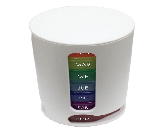 Pastillero apilable semanal, 7 bandejas extraíbles, cada uno con 4 divisiones internas para un mejor control. Esta torre se carga en la parte superior y se extrae por la parte inferior.