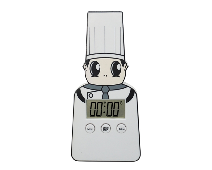 Temporizador de cocina en forma de chef de 99 min./59 seg. Incluye imán en la parte trasera y batería de botón para su funcionamiento.