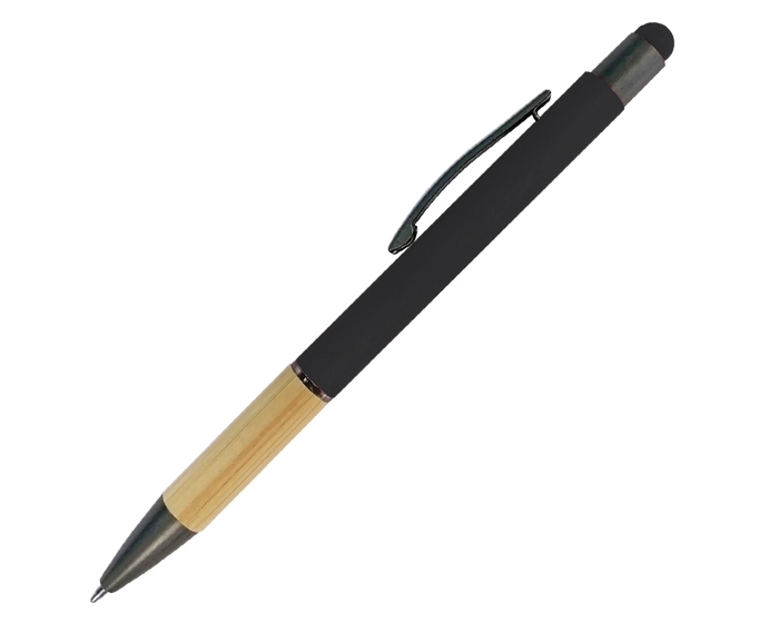 Bolígrafo de aluminio con touch screen, grip de bambú, clip de metal, cuerpo con terminado tipo rubber. Mecanismo de click.
