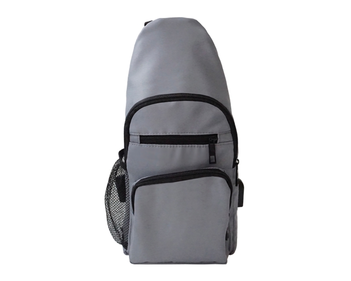 Pechera impermeable con correa ajustable, bolsa de malla lateral, entrada de carga puerto USB, bolsa frontal, bolsa superior y bolsa principal con compartimento interno. Incluye cable para carga.
