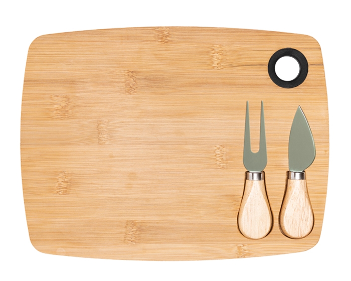 Tabla de bambú, Incluye: 1 cuchillo, 1 tenedor de acero inoxidable con mango de madera. Cuenta con 2 compartimentos imantados para colocar los utensilios y un arillo de silicón.