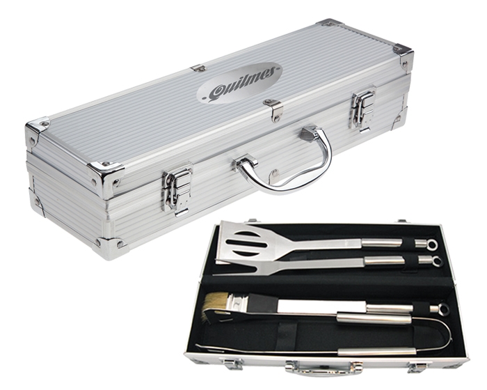 Estuche de aluminio con juego de BBQ. Incluye: tenedor, volteador, pinzas y brocha. Presentación: caja en color blanco.