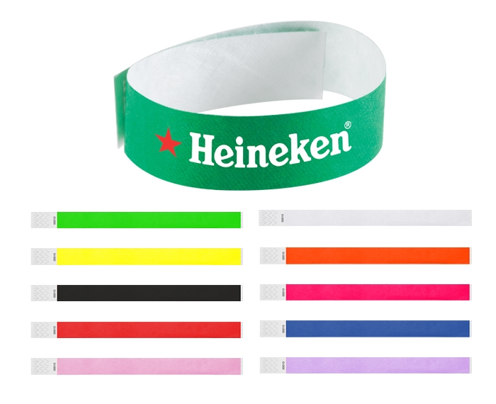 Planilla de brazaletes de papel plastificado de 20 piezas, irrompible, especial para impresión, sello con folio y pegamento. Área máxima de impresión: 14 x 1 cm.