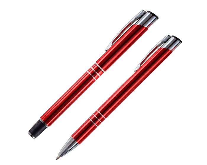 Set de bolígrafos metálicos de tinta negra. Un bolígrafo de punto fino tipo roller con tapa y un bolígrafo con mecanismo de click. Incluye estuche plástico en color gris y tapa transparente.