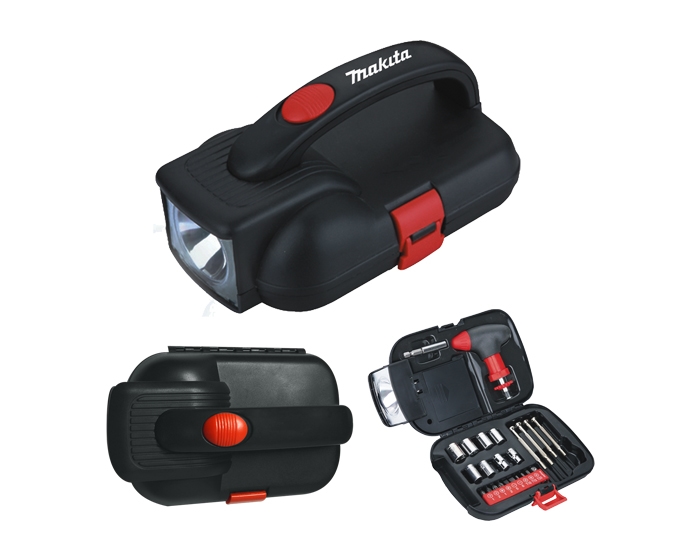 Juego de herramientas con lámpara. Incluye: maneral y extensión, 8 dados, 10 puntas de desarmador, 4 desarmadores de relojero. Utiliza 4 baterías AA (no incluidas).