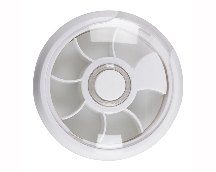 Despachador giratorio de pastillas. Con 7 divisiones. El mecanismo se activa presionando el botón para cambiar de compartimento.