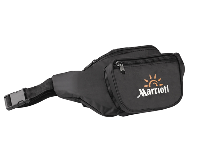 Cangurera con dos compartimentos, bolsa con cierre al frente, cinta ajustable a la cintura con seguro de presión.