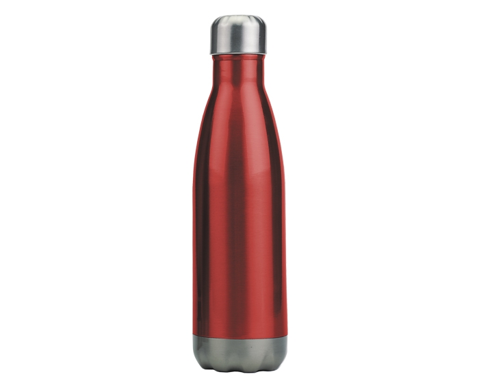 Termo de acero inoxidable forma de botella conserva frío24 hrs y calor 12 hrs. Doble pared y capa interior de cobre. Con tapón de sellado hermético para evitar cualquier derrame. CAP. 480 ml.