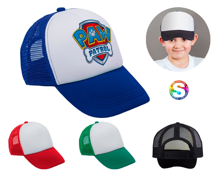 Gorra en poliéster para niños con amplio frente acolchonado y 4 gajos en malla. Ajuste con broche de plástico.